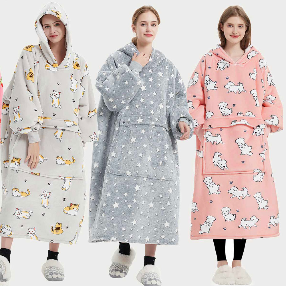 • Designs:Wearable blanket combines the efficiency of the"hoodie"design, which resulted in super comfortable and very warm hoodie blankets.not only does this hooded sweatshirt style have a sherpa lining, kangaroo pouch, and ribbed cuffs, but it's also available in a range of fun prints.