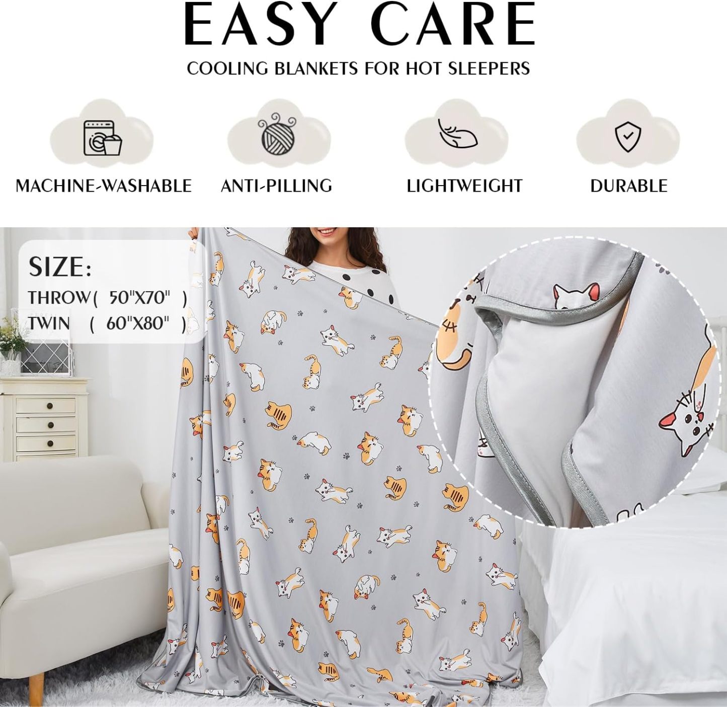 Keep Cooling: This cooling blankets are made of 50% nylon,50% polyester material, the fiber structure is porous, multi-slit, and hollow, so it's 3-5 times better than cotton in moisture absorption and breathability.Ideal for hot sleepers whose suffering from hot flashes and night sweats, you will feel much cooler than using other cotton blankets.